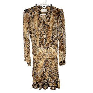 BA&SH Ruched Sheer Draped Ruffles Asymmetrical Snake Animal Print Beige Dress 0
