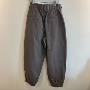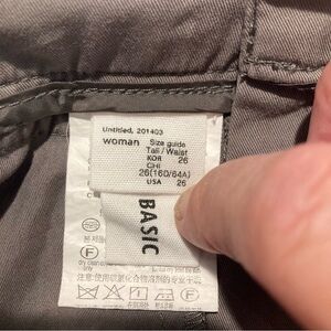 BASIC HOUSE Sz 26 Cargo Style Pants Buckle Closure Pockets Elastic Hemline Pants. Very unique pair of pants. Flaps over the front pleats. Buckle closure to the side to insert the belt. Zipper closure. Cargo style elevated for a trendy edgy look.
