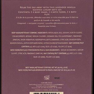 Relax the day away with this Lavender Vanilla scented luxury bath set