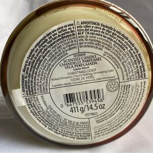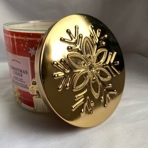 Bath and Body Works (White Barn) 3 wick scented candle, Christmas Cider scent. (mulled cinnamon, creamy nutmeg, simmering cider). Made with essential oils. Has a gold tone lid with snowflake design.