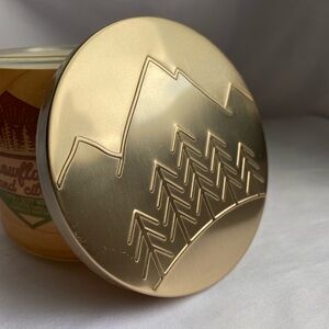 Bath and Body Works 3 wick scented candle, Snowflakes and Citrus scent. Has a gold tone lid with mountains and trees scene.