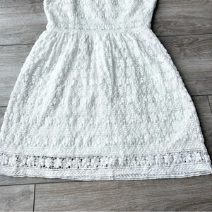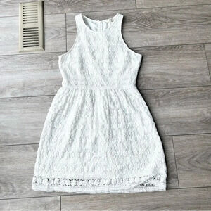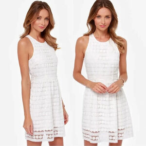 The BB Dakota Andree White Lace Dress is a lacy dream that you won't want to wake from! A high rounded neck and sleeveless bodice boast beautifully crocheted lace running horizontally throughout the fitted bodice. Blooming below is a charming flared skirt.