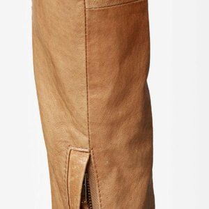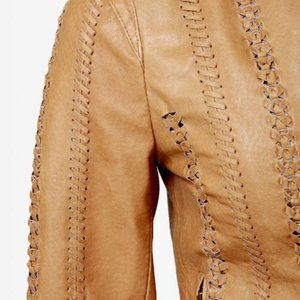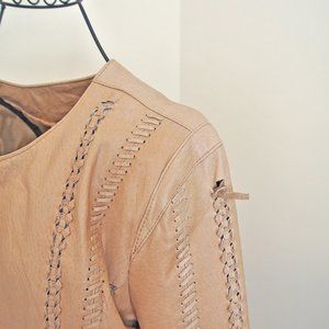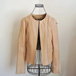 Luxurious light brown jacket, beautifully crafted with looped and whip-stitched details along the tailored bodice and tapered sleeves. Brass zippers run smoothly along the sleeve cuffs, front welted pockets, and hidden zip-front. Round neckline. Fully lined in gold satin.