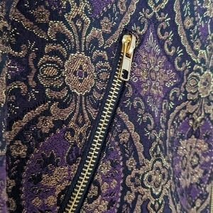 This lightweight jacquard baseball jacket features an ornate purple and metallic gold brocade pattern and exposed zipper accents. This glam twist on a classic sporty style is sure to earn you plenty of style points.