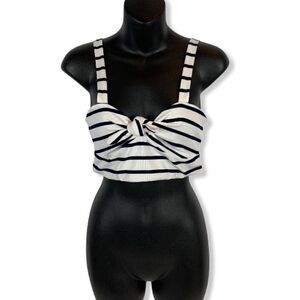 Fabric: Jersey Stripe pattern Cropped profile Tank style Sleeveless Tie at front Lined Shell: 72% polyester/24% viscose/4% spandex