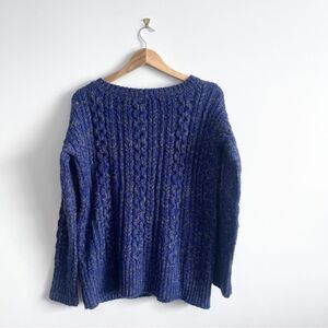 BB Dakota Cable Knit Chunky Sweater Blue Gray Diagonal Zipper Women's M Acrylic. This is a cute chunky crew neck cable knit sweater. It is blue and gray, and is a nice heavier weight soft sweater. It has a diagonal zipper detail at the bottom. Very good used condition. Please see photos for approximate measurements.
