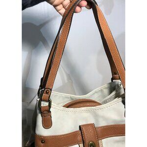 B.Ø.C Double Handle White & Brown Faux Leather Purse With Front Turn-Lock & Zipp