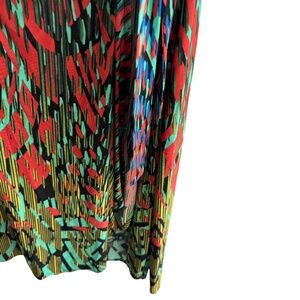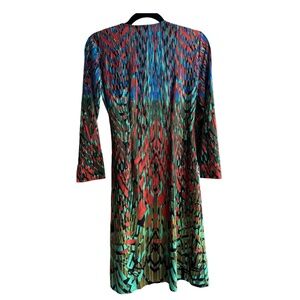 This striking BCBG Adele Wrap Dress is a size small and features a multicolored abstract print that blends electric blue, forest green, gold, coral, and black, creating a bold and eye-catching statement. The wrap-style design with an attached belt cinches the waist, offering a flattering silhouette. The knee-length, midi cut with a bodycon fit ensures both elegance and comfort. Long sleeves make this a versatile piece, perfect for year-round wear.