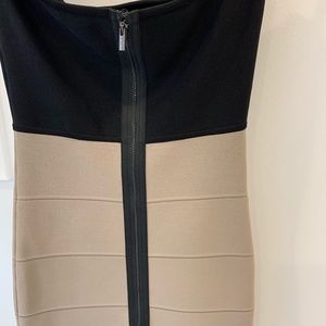 Strapless bandage construction colour block dress (black and taupe/beige). Exposed back zipper closure. 10/10 condition.