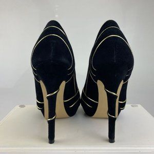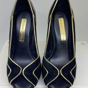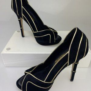 BCBG BLACK SUEDE WITH GOLD PIPING PEEP TOE PUMPS