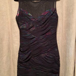 Sheer black fabric over multi-coloured pattern (which can be seen with flash or in daylight), with beautiful jewelled accents on front/back of neck.