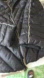 Chic black quilted jacket. Features a cozy hood and white trim accents.