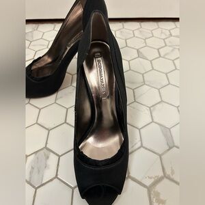 BCBG Black Satin Peep-Toe Pumps, Sz 7.5