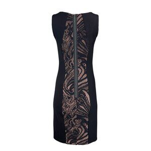 A nude lined lace panel down the front of this sleeveless sheath dress by BCBG creates a sexy illusion.