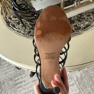 These BCBG heels feature a sophisticated strappy design with a sleek stiletto heel, perfect for formal occasions. The black color and open toe style add versatility and elegance to any outfit. These heels are an excellent used condition. There is a little bit of a scratch on the heel. There is a picture.