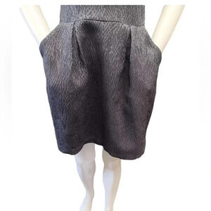 Lead in color, this mini features a square neckline, full lining and a rear zipper and clasp closure. A textured material.