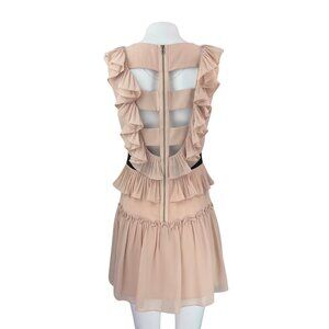 Sleeveless with the most amazing cut out back on this ruffle dress in dusty rose with black belt.