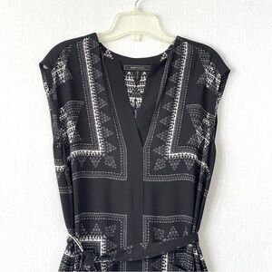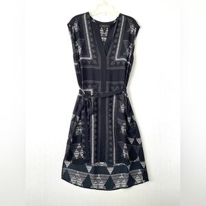 Evoke effortless-chic in this cap sleeve shift dress in a graphic scarf print on crepe.