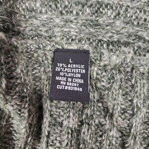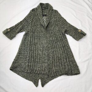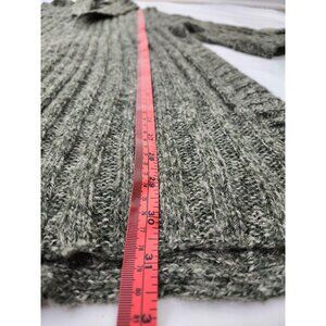 knit cardigan, forest green, crochet, button sleeves, open front, layering sweater, ribbed knit, casual wear, cozy sweater, large size, BCBG, acrylic blend, unique design