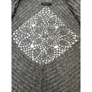 BCBG knit cardigan with a stylish crochet back and buttoned sleeves. Cozy and versatile for layering.