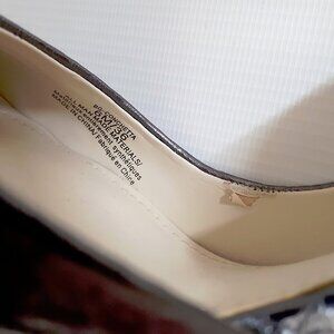 Classic office pumps in an edgy metallic grey colour. Almond toe. Dorsay cutout on the instep. Synthetic material. Well loved but in good condition. Please note some damage on the inside lining of right shoe due to insoles that were worn with these.