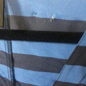 V-neck with 3/4 length wide sleeves with banded cuffs. Allover stripe with hem drawstring.