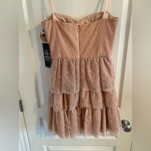 Tiered-lace detail. Drop-waist skirt. Lace trim at hem.