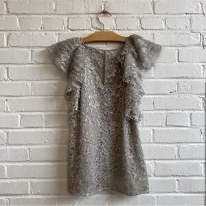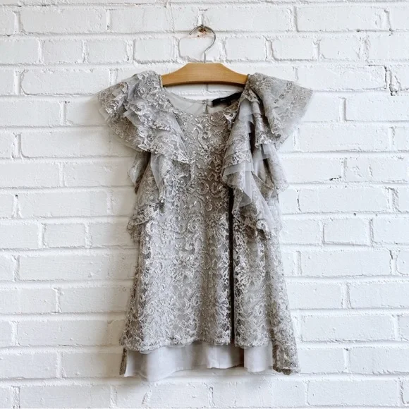 BCBG MaxAzria chic lace top with ruffle details. Perfect for any occasion.