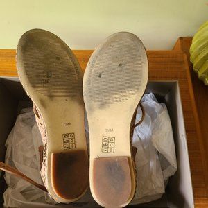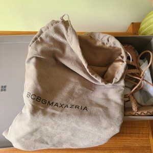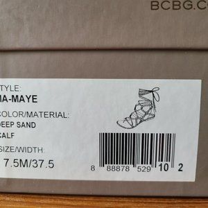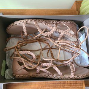 Super comfy nude lace-up sandal from BCBGMaxAzria. Leather laces can be wrapped up leg or tied in bow. Moderate padding, good stability. Worn lightly for a summer. No damage, aside from normal wear marks on soles. No foot imprints! They are yours to mold with wear!