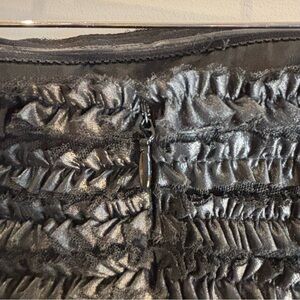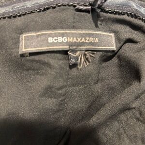 BCBG MAX AZRIA Sz S (estimated) Strapless Ruffles All Over Sheer Maxi Dress This elegant black strapless dress is perfect for any formal occasion. Its sophisticated design and classic color make it a versatile addition to your wardrobe. Evening wear. Statement piece. NO SLIP. You can add your own or wear as is with micro shorts and a bandeau bra. Satin like fabric on belt and ruffles.