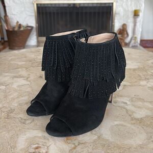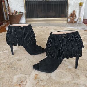BCBG MAXAZRIA Raimi Bootie Black Suede Peep Toe Fringe High Heel Ankle Boots
