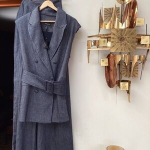 BCBG MAXAZRIA DENIM THREE PIECE SUIT, INCLUDES VEST, WIDE LEGGED PANTS, AND KNEE LENGTH SKIRT