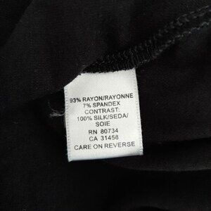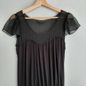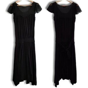 • Short sleeve scoop neck midi dress in soft and stretchy black fabric with tie waist and upper raw edge mesh panel.