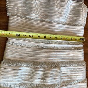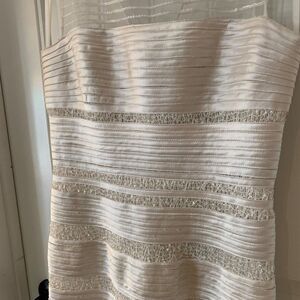 New with tags from BCBG Max Azria. The most exquisite gown in just off white, size 4. Full length and sleeveless with sheer and cut away from shoulder front scoop neckline that opens up the face and lets you shine. Note-the thin white straps showing in photos are hanging ribbons only and will not show when gown is worn. Rows of sequins applied on all areas of the loop lace ribboning and the front sheer neckline. Very discreet sparkle, romantic in the light. The body of the gown consists of stacked rows of satin ribbon, in varying multiples the full length of the gown, interspersed with an open and looped, sequined lacey ribbon. Interesting and subtle. This gown has a classic, regal look to it, something Meghan might wear. Suitable for a wedding, prom, formal event. Add classic accessories found in Our Closet (some suggestions shown, listed and priced separately) to complete this polished look. Wow- look at you getting Fresh with Lemon Squeezy Shop🍋