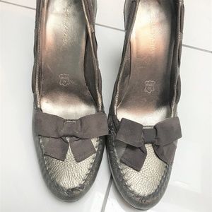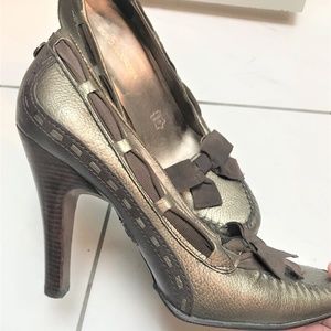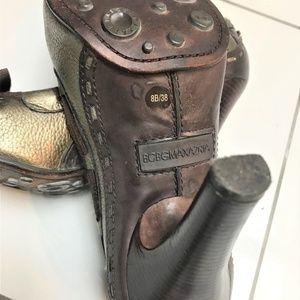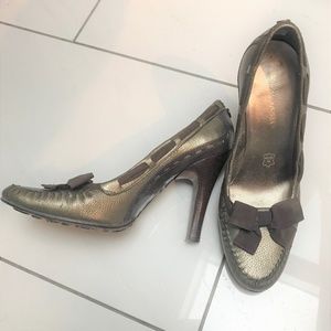 Excellent used condition. Genuine leather uppers and sole, color is a muted bronze gold (an understated, beautiful colour- not in-your-face gold). Soles are nice and grippy - easier to walk on smooth surfaces.