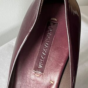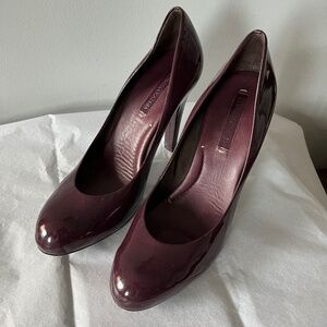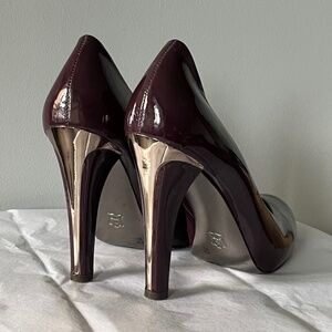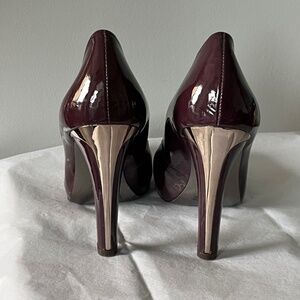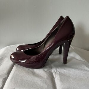 BCBG MaxAzria (39.5 B) burgundy patent leather platform heels.