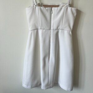 BCBG white cocktail dress with lining. Mini silhouette with a wrap-style front and removable straps. Lace detail.