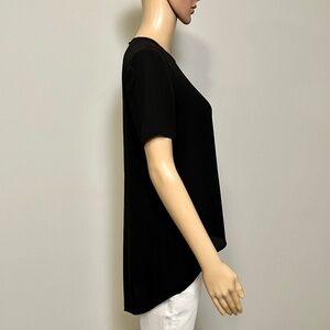 Unique black top with a crew neckline, short sleeves and a high-low hemline with a back split similar to tuxedo tails. Pull-over style with a keyhole button closure at back of neck. Fabric has a lovely drape and can be dressed up or down. 100% Polyester. Machine washable.