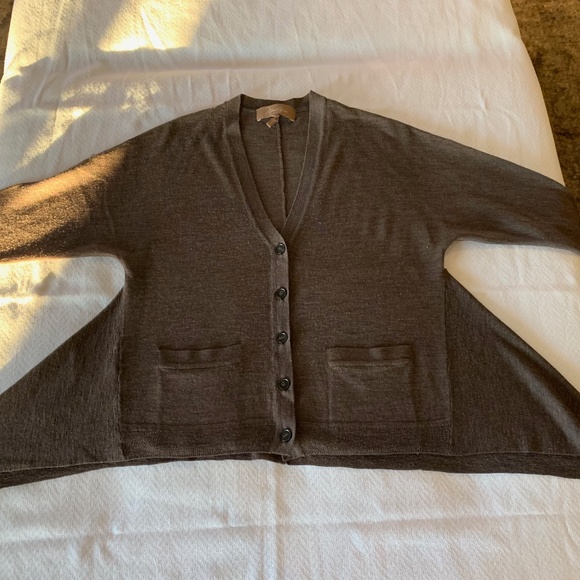 Details: 3/4 sleeve with v neck button down. Asymmetrical hemline. Pockets. Very unique style.