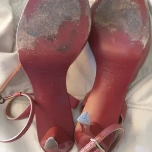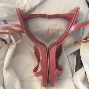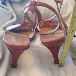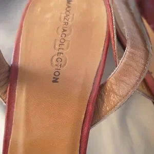 Beautiful designer dark red BCBG MaxAzria Collection high heeled sandals. Hole buckle detail. Centered heel. previously used but in very very good condition. Wear on soles( see last photo)