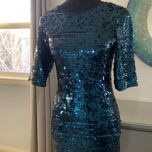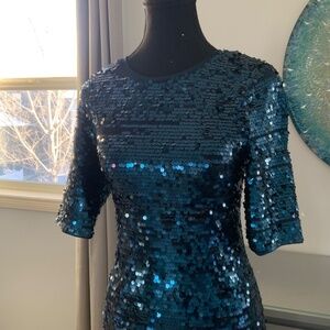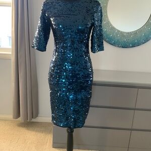 Amazing dress, beautiful blue sequins and tons of stretch. Size small. Dress is missing some sequins as shown in pictures but not nearly as noticeable in person as the mesh below is black. Please inspect pictures carefully.