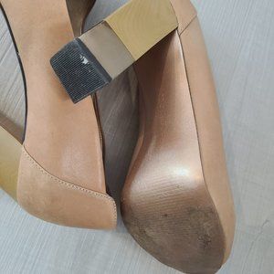 BCBG Nude Open Toe High Heels w Wood Accent Heel & Bronze Detailing