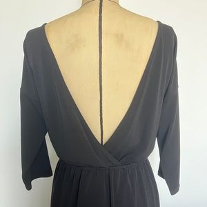 3/4 sleeve, dropped shoulder, boat neck front, deep fold-over v-cut at back. Knee length.