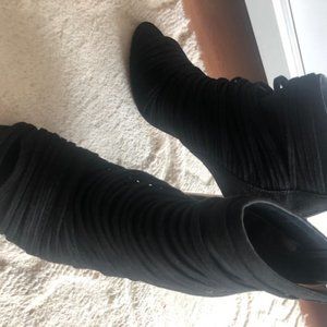 Black suede, open toe, stylist booties! These have a great look and sit on a perfectly poised heel (3 1/4")