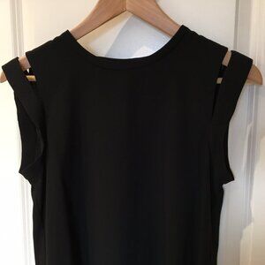 Open back "Cailin" top by BCBGMAXAZRIA in size XXS, in black. Open shoulders, asymmetric hem. Tulip back opening with button closure. Armpit to armpit 19 inches flat. 77% triacetate, 23% poly. New, never worn, with tags. Retailed for $183. A fun piece that shows off your fancy bra in the back. I bought it to go with the "Arden skirt", see my other listing.