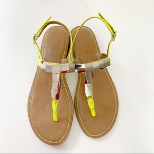 Bright and shiny! Neon yellow with overlapping silver squares on t strap sandals. Patent leather look. Adjustable side strap. 1 inch heel.
