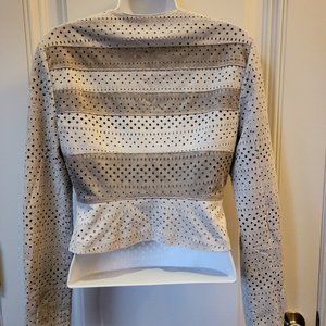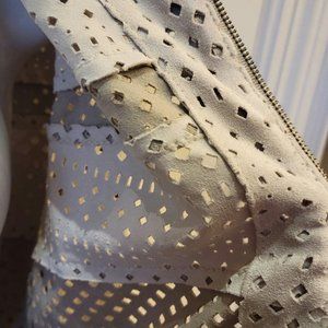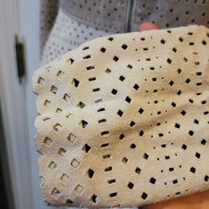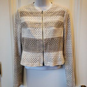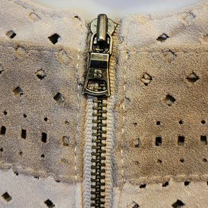 BCBG, NWOT, Size XS, Perforated Faux Suede Zip Jacket which feels like real suede. Tan and cream colour blocked. First 3 images are stock photos including the one with the price tag. This jacket does not have a price tag attached.