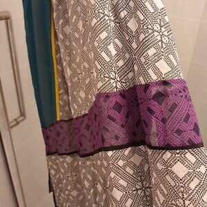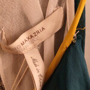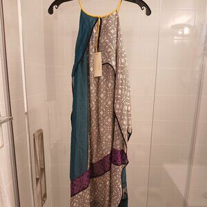 Halter neck. Sleeveless. Color-blocked. Asymmetrical draped front panel. Hem is longer at right side. Concealed side-seam zipper with hook-and-eye closure. Flowing Chiffon: Silk.