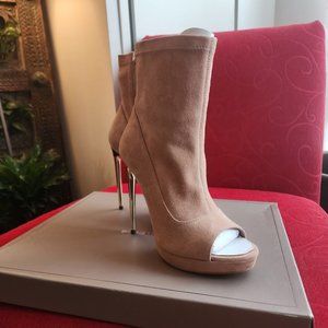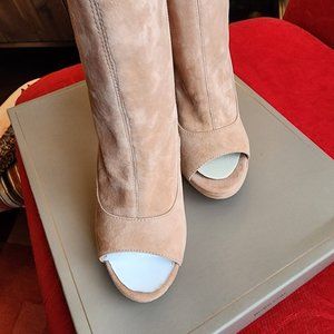Beautiful brand new stretch suede open toe stilettos. Gold Heel, Approx 5 inches with 3/4 inch platform. Labeled as size 7, fits like a 6. Love them, never worn except tried on, but dont fit. Comes in box with all original packaging. Beautiful shoes. Best for size 6 with slim foot.