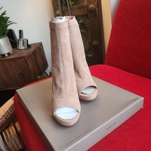 BCBG STRETCH SUEDE OPEN TOE STILETTOS